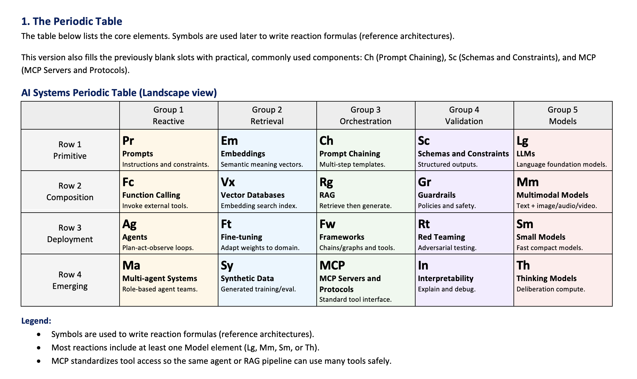 Real-world AI products are not “just an LLM.” They are systems assembled from reusable components—like chemistry. A periodic table is valuable not for memorization, but for predicting reactions: which parts combine well, where failures happen, and what validation makes systems trustworthy.